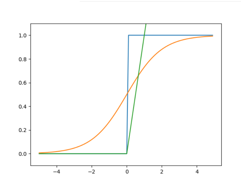 import numpy as np import matplotlib.pylab as plt def step_function(x): return np.array(x>0, dtype=np.int) def sigmoid(x): return 1/(1 + np.exp(-x)) def relu(x): return np.maximum(0, x) #계단 x0 = np.arange(-5.0, 5.0, 0.1) y0 = step_function(x0); plt.plot(x0, y0); plt.ylim(-0.1, 1.1) #시그모이드 x1 = np.arange(-5.0, 5.0, 0.1) y1 = sigmoid(x1) plt.plot(x1, y1); plt.ylim(-0.1, 1.1) #ReLU x2 = np.arange(-5.0, 5.0, 0.1) y2 = relu(x2) plt.plot(x2, y2) plt.ylim(-0.1, 1.1) plt.show()각 함수를 그래프까지 그려봤습니다.