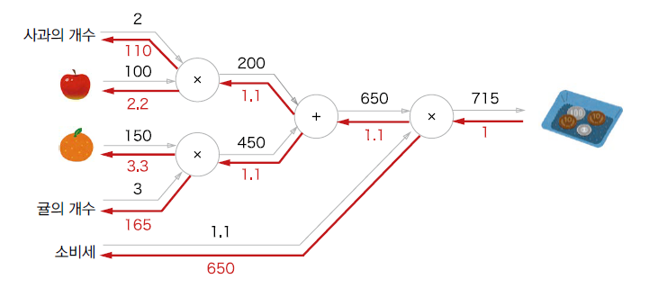 apple = 100 orange = 150 apple_num = 2 orange_num = 3 tax = 1.1 #계층들 mul_apple_layer = MulLayer() mul_orange_layer = MulLayer() add_apple_orange_layer = AddLayer() mul_tax_layer = MulLayer() #순전파 apple_price = mul_apple_layer.forward(apple, apple_num) orange_price = mul_orange_layer.forward(orange, orange_num) all_price = add_apple_orange_layer.forward(apple_price, orange_price) price = mul_tax_layer.forward(all_price, tax) #역전파 dprice = 1 dall_price, dtax = mul_tax_layer.backward(dprice) dapple_price, dorange_price = add_apple_orange_layer.backward(dall_price) dapple, dapple_num = mul_apple_layer.backward(dapple_price) dorange, dorange_num = mul_orange_layer.backward(dorange_price) print(price) # 715 print(dapple_num, dapple, dorange, dorange_num, dtax) # 110 2.2 3.3 165 650