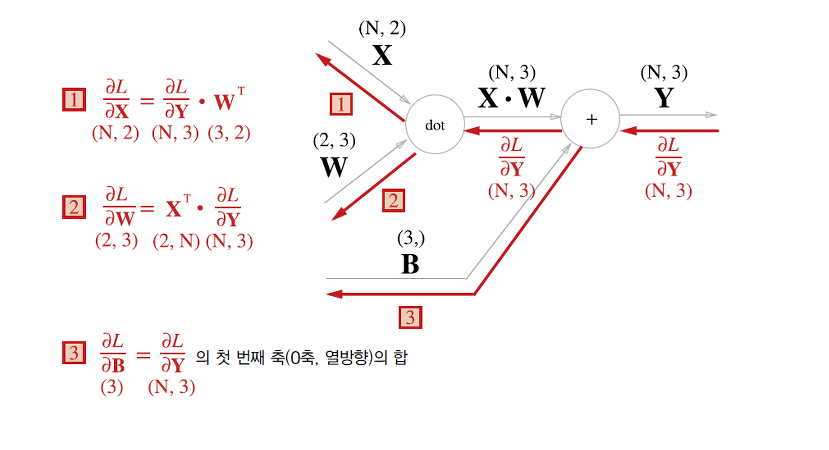 class Affine: def __init(self, W, b): self.W = W self.b = b self.x = None self.dW = None self.db = None def forward(self, x): self.x = x out = np.dot(x, self.W) + self.b return out def backward(self, dout): dx = np.dot(dout, self.W.T) self.dW = np.dot(self.x.T, dout) self.db = np.sum(dout, axis=0) return dx[참고]